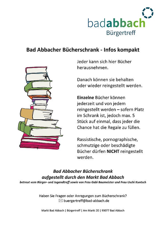 Ansprechpartnerin seitens der Verwaltung ist Andrea Birzer. Bei Fragen und Anregungen rund um den Bücherschrank, melden Sie sich gerne bei ihr per E-Mail (buergertreff@bad-abbach.de) oder telefonisch unter 09405/9590-29.