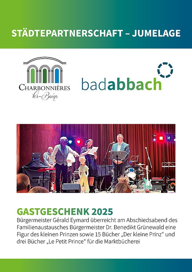Bürgermeister Gérald Eymard überreicht am Abschiedsabend des Familienaustausches Bürgermeister Dr. Benedikt Grünewald eine Figur des "kleinen Prinzen" sowie 15 Bücher „Der kleine Prinz“ und drei Bücher „Le Petit Prince“ von Antoine de Saint-Exupéry für die Marktbücherei.