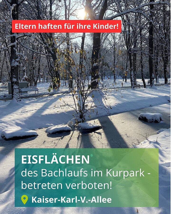 Eisflächen des Bachlaufs im Kurpark nicht betreten!