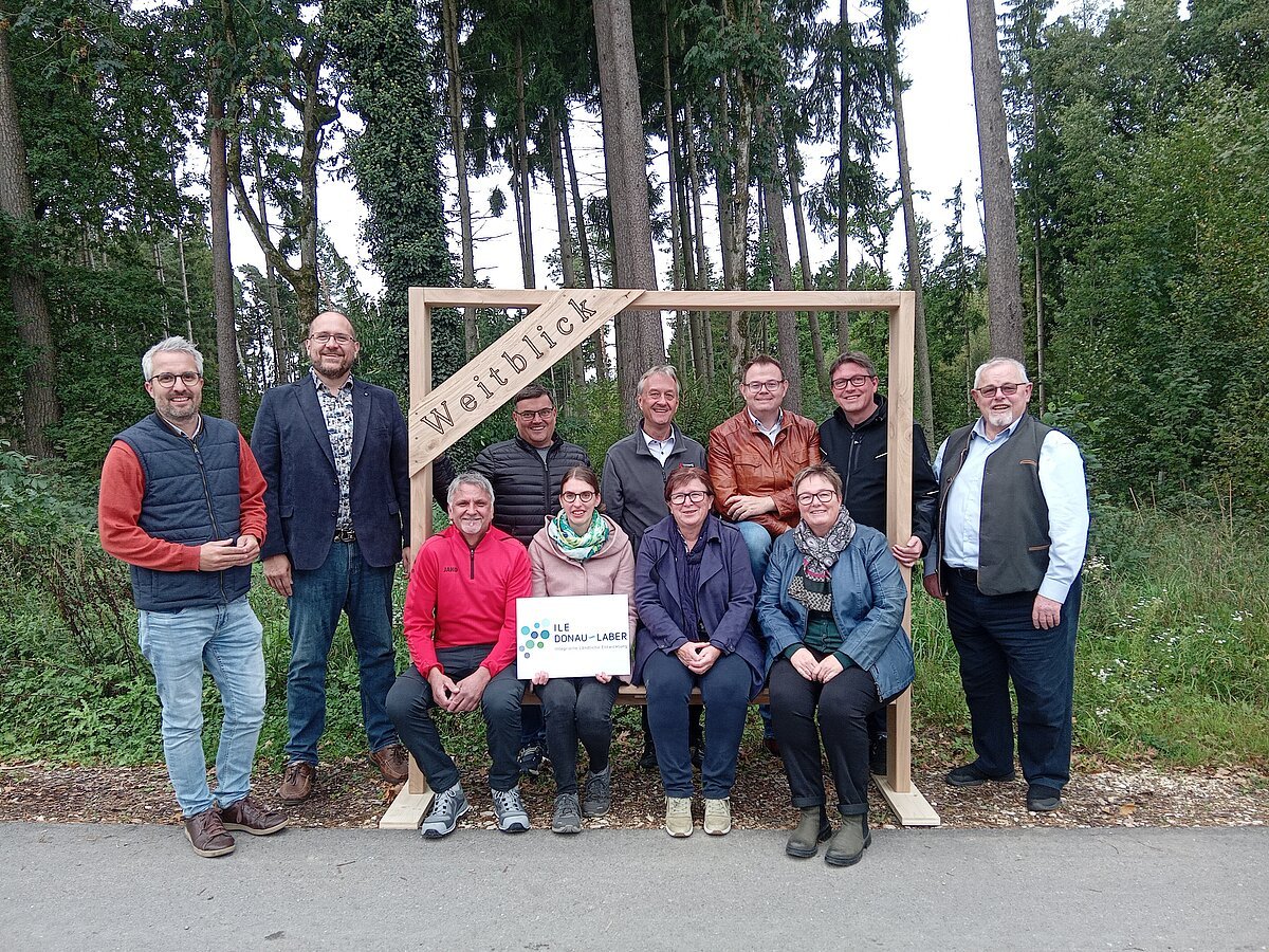 Die Bürgermeister der ILE Donau-Laber begutachteten den gemeinsamen Fotorahmen zusammen mit der Umsetzungsbegleitung Teresa Weis (2. sitzend v. l.), Sven Päplow vom ALE Niederbayern (2. stehend v. l.), Florian Best vom Tourismusverband Kelheim (1. stehend v. l.) sowie Thomas Donauer vom Bauhof Hausen (1. sitzend v. l.)