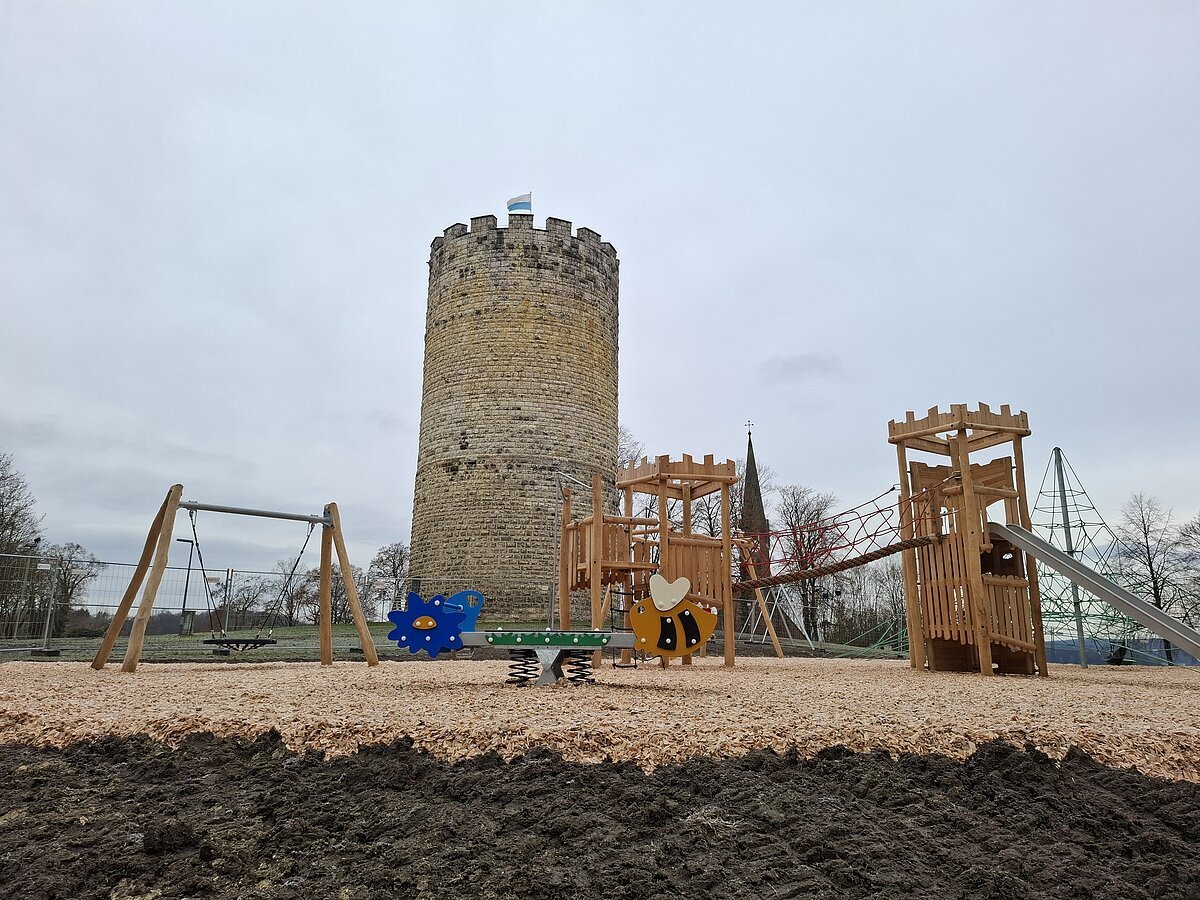 Am 14. Dezember 2025 ab 14.30 Uhr ist es nun so weit, der neue Spielplatz am Burgberg wird eröffnet, dazu sind alle herzlich eingeladen. Schauen Sie was in der schönen Kulisse des Heinrichsturms entstanden ist.