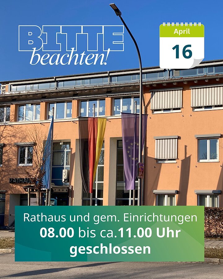 Am Donnerstag, den 16.04.2026, bleiben das Rathaus Bad Abbach und alle gemeindlichen Einrichtungen von 08.00 bis ca. 11.00 Uhr wegen einer internen Versammlung geschlossen.Vielen Dank für Ihr Verständnis.