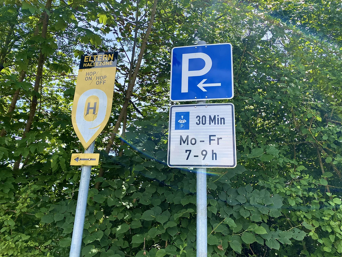 - Elternhaltezone: Montag bis Freitag: 07:00 bis 09:00 Uhr | 30 Minuten mit Parkscheibe