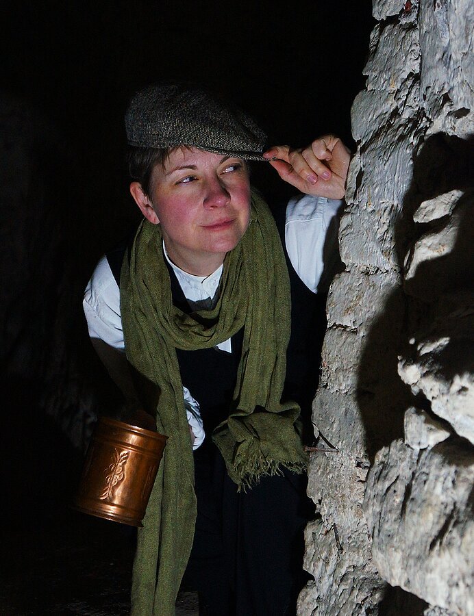 Person mit Schirmmütze und grünem Schal hält Kupfergefäß und blickt an Steinmauer im Dunkeln vorbei.