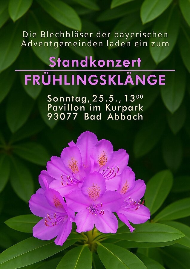 Etwa 50 Musiker (Blechbläser, Holzbläser und Streicher) aus verschiedenen Posaunenchören der Adventgemeinden in Bayern treffen sich alljährlich für ein Wochenende in der Musikakademie Alteglofsheim zum gemeinsamen Proben und zur Freude am Musizieren. Zum Abschluss ihres diesjährigen gemeinsamen Wochenendes laden sie die interessierte Öffentlichkeit ein, im Rahmen eines Frühlingskonzertes an dem Erarbeiteten Anteil zu nehmen. Das mit „Frühlingsklänge“ bezeichnete Standkonzert findet am Samstag, den 2. Mai, um 15.00 Uhr, im Pavillon des Kurparks Bad Abbach statt. Dem Titel entsprechend wird ein musikalischer Blumenstrauß aus verschiedenen Epochen in unterschiedlichen Instrumentalbesetzungen präsentiert, so dass mit Sicherheit für jeden etwas dabei sein wird.