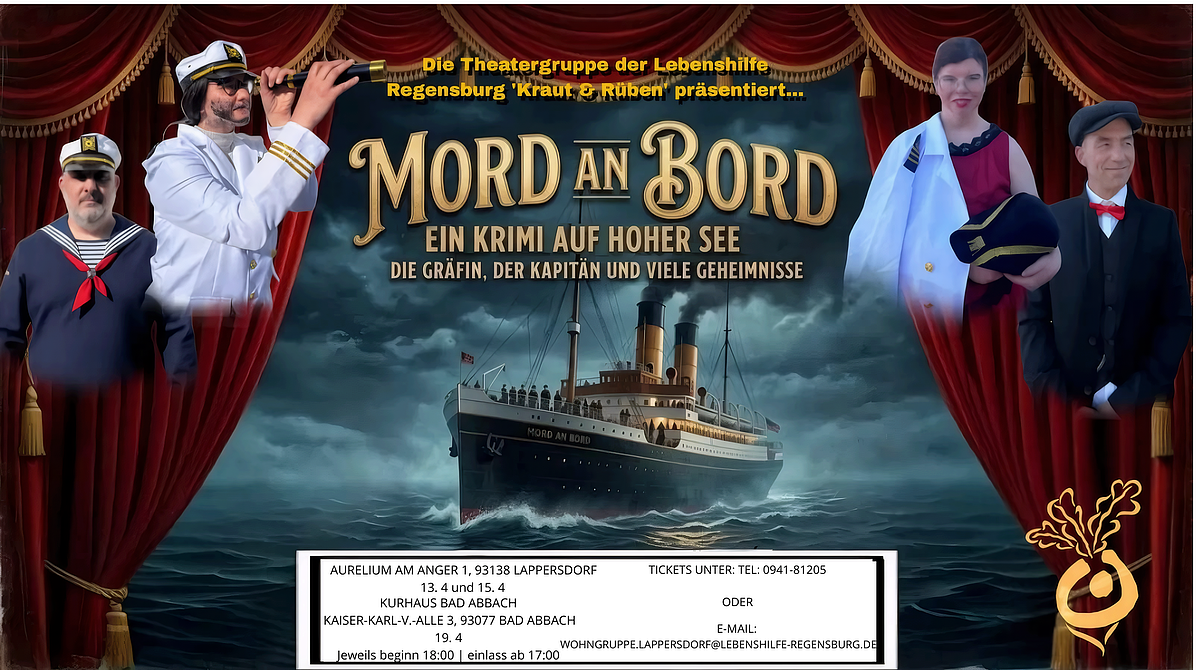 Die Theatergruppe „Kraut und Rüben“ der Regensburger Wohnstätten begibt sich mit dem Stück „MORD an BORD“ auf hohe See. Ein Schulschiff der kaiserlichen Marine, zu Beginn des letzten Jahrhunderts, auf dem ein Mord passiert und eine Dame, die Gast an Bord ist, lässt er keine Ruhe. Jeder hat ein Geheimnis an Bord, aber wen treibt es zum Mord? Die Theatergruppe der Regensburger Wohnstätten sorgt auch bei diesem ernsten Thema für kuriose Momente und fasziniert mit ihrer Einzigartigkeit. Bei dem Stück unterstützen Schüler:innen der Fachschule für Heilerziehungspflege der Barmherzigen Brüder in Tegernheim in allen Bereichen