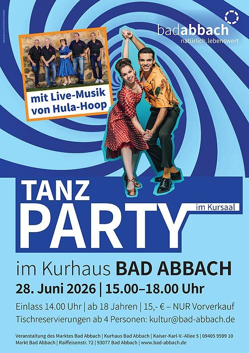 Dann laden wir Sie herzlich zu unserer Tanzparty ein. Erleben Sie die mitreißenden Klänge der letzten Jahrzehnte mit der Band „Hula Hoop“, die die besten Hits aus Schlager, Swing und Rock´n´Roll zum Besten geben.